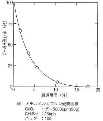 、メチルメルカプタンの実験例です。臭気成分の一つで あるアンモニアとは反応しないが、嗅覚いき値の低いアミンと反応し、その反応性は、第3>第2>第1アミンの順のようです。